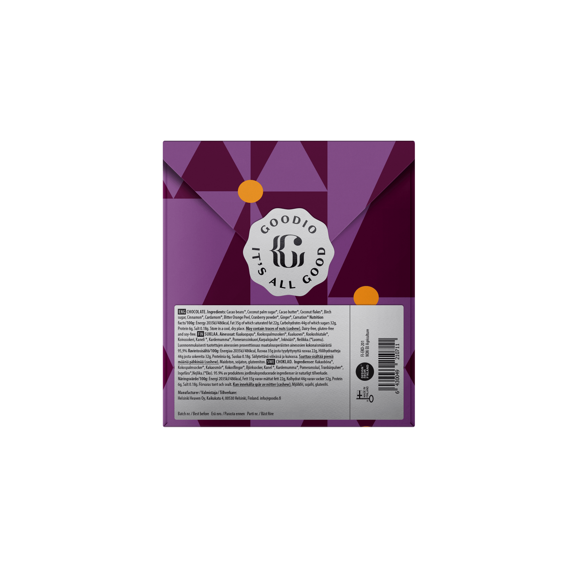 This bar is proudly handmade with love in Finland - the happiest country in the world by Goodio Chocolate Artists.